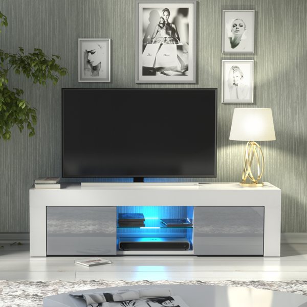 Add a fresh, contemporary look to your living space with this 130 cm modern TV cabinet, crafted with a smooth white matt body and contrasting grey high gloss doors. Designed for modern interiors, this sleek and compact unit combines smart storage with elegant presentation. Two enclosed cupboards keep your essentials out of sight, while the central open display area with a glass shelf is ideal for media equipment and decor items.