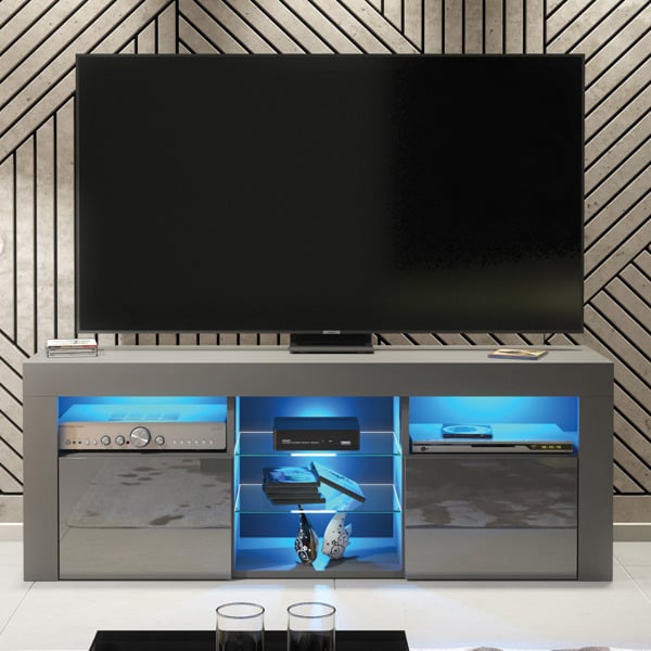 The unit features two spacious cupboards with handleless grey gloss doors on each side, providing ample hidden storage for consoles, accessories, or everyday essentials. In the centre, two glass shelves offer open space for display or media devices, beautifully illuminated by the included LED lights.