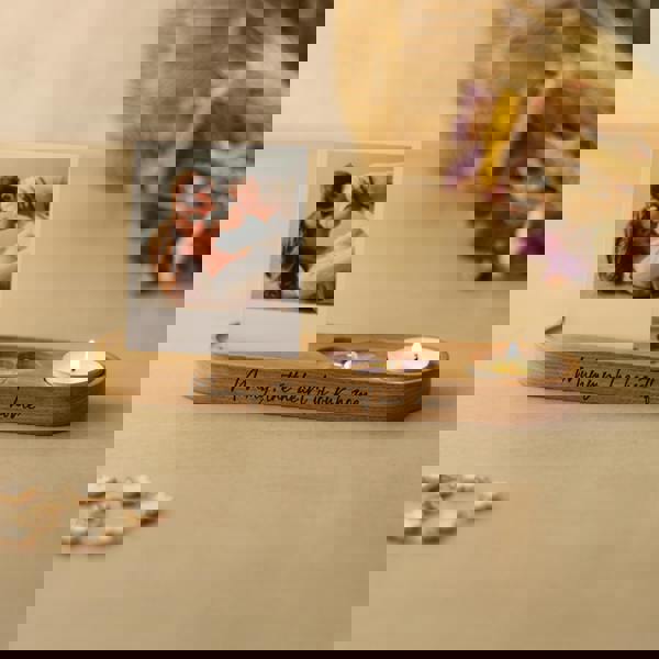 Handcrafted in the UK by MijMoj Design, this personalised Candle and Photo Holder with Heart Shape Keepsake Tray is designed to turn a favourite photograph into a lasting display. Engraved with your chosen message, it brings together a softly lit tea light and a dedicated photo slot, creating a thoughtful piece for celebrating love, family and everyday memories.