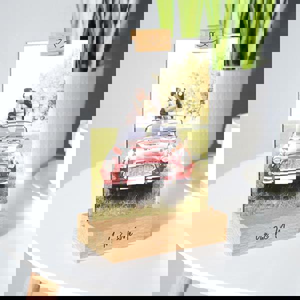 A beautifully crafted UK-made solid oak base, featuring a heart-engraved accessory clip to display your cherished photo or photos.