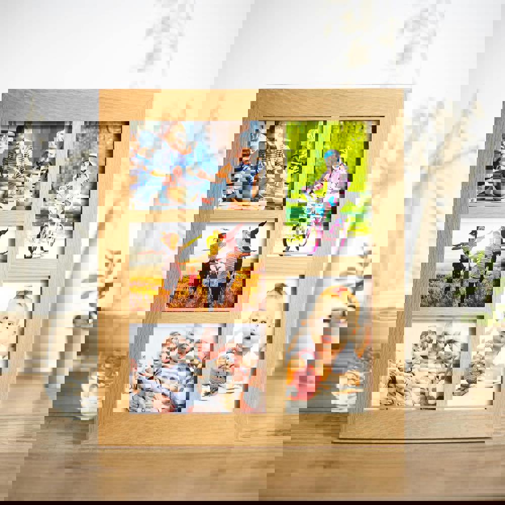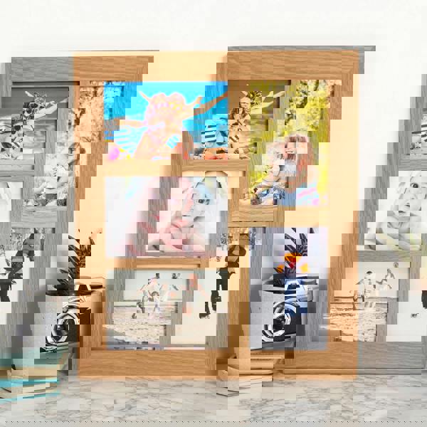A beautiful solid oak five-aperture photo frame designed to display five treasured 6×4" photo prints in either portrait or landscape orientation. Free-standing or wall-mounted, a timeless way to showcase special memories, perfect for family photos, milestone moments, or as a thoughtful gift.
