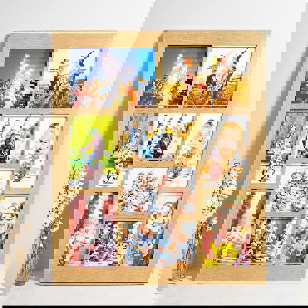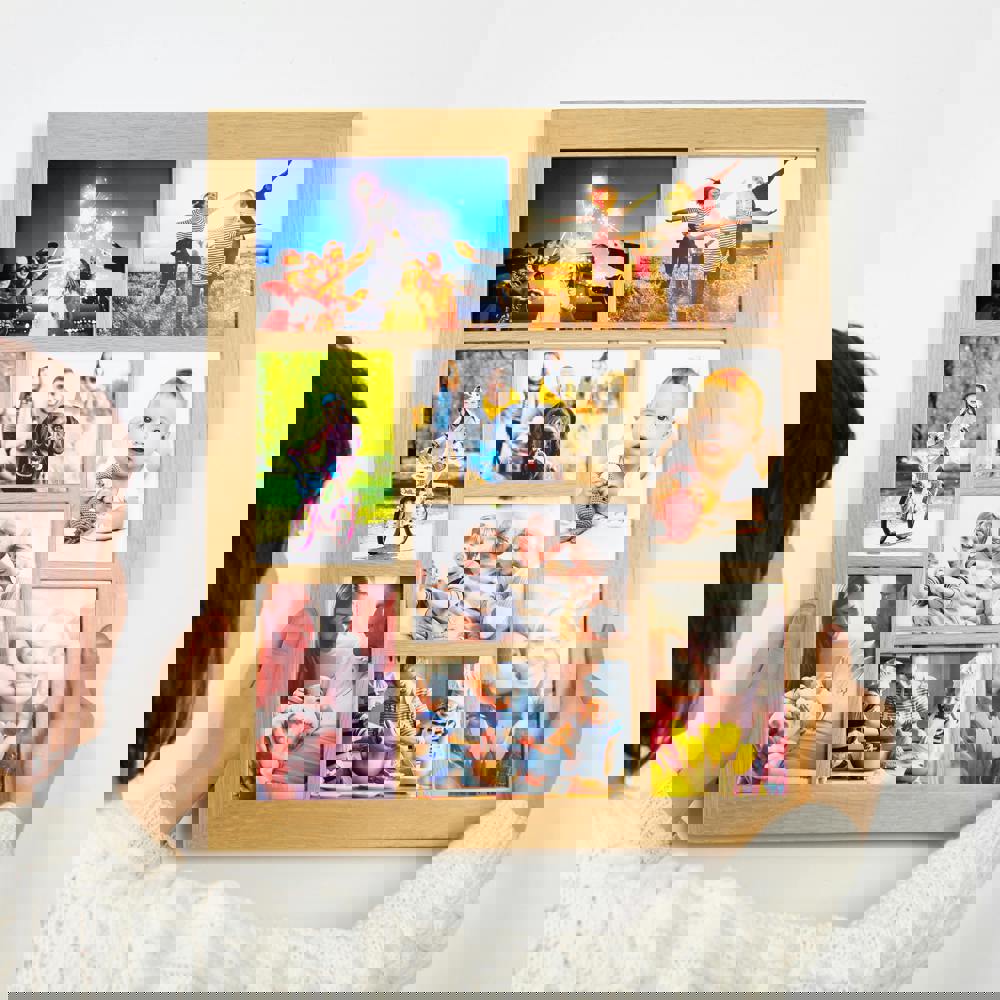 A premium multi photo frame in solid oak to display your treasured photographs. This wooden picture frame comes in a lacquer finish and can hold nine photos in a portrait or landscape orientation. The multi photo frame has apertures suitable for seven 6x4 photos and two 7x5 photos. Designed to be wall mounted with brackets attached.
