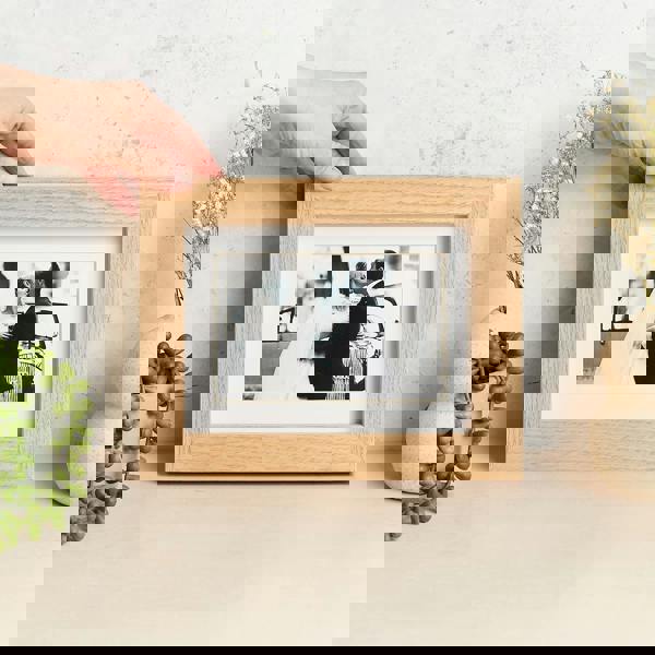 A contemporary solid oak personalised mounted photo frame for 6x4" print. This beautiful and substantial high quality wooden picture frame comes in a lovely clean light natural finish. Can either be displayed free-standing or wall-mounted.