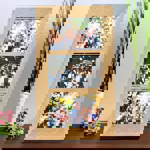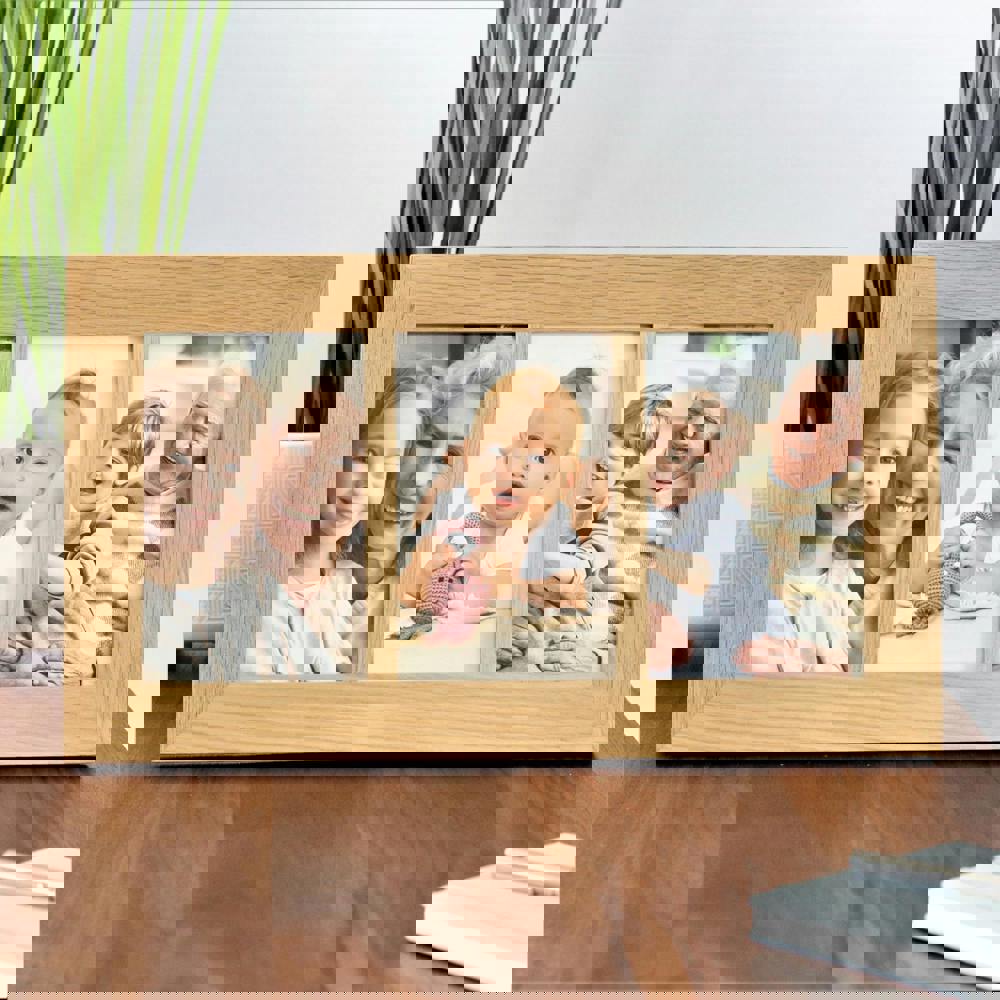 Premium solid oak three-aperture picture frame designed to display three treasured 6x4" photo prints in style. Freestanding or wall-mountable, it’s perfect for showing off family memories, holiday photos, or special occasions in a beautiful frame.