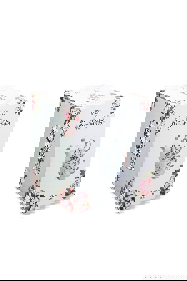 Immersing yourself in the whimsical world of Alice, scenes from the Mad Hatter's tea party grace the sides, showcasing intricate illustrations inspired by Sir John Tenniel's renowned work. Quintessentially British, each piece is then uplifted with pastel colours and the V&A's signature floral.