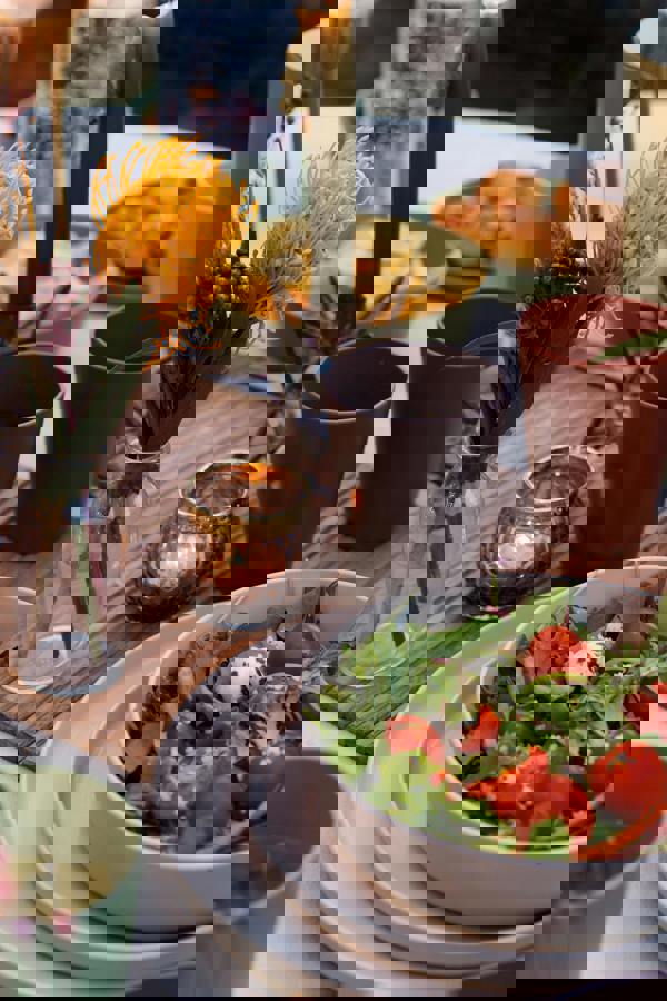 Serve Greek salad, side rice and toasted nuts to entertain your guests with a cheerful display, featuring four different colours, including terracotta, green, grey and warm grey.