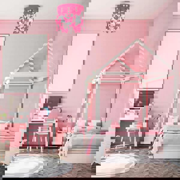 The Angelica by Milagro is a delightful 30cm hand made ceiling light. The delicate metal butterflies are suspended around the light sources by droplet crystals creating fascinating patterns of light and shadows. The hot pink chandelier would brighten up any bedroom but would also make a boutique chic centrepiece to a kitchen or conservatory