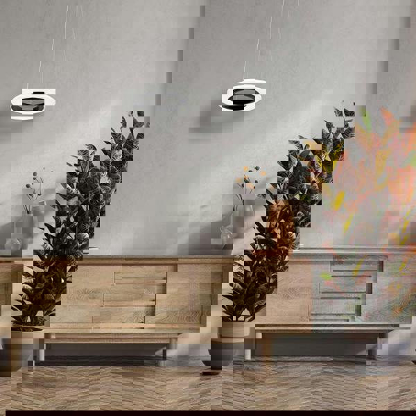 The Cosmo by Milagro is a range of contempory stylish circular ring lights available as ceiling, floor and table lamps. These ultra modern lamps are finely crafted from alumininium and acrylic and give the effect of black iron supporting the built in ultra efficient LED light modules. The hypnotic hoop design gives a great effect in any modern interior setting and certainly provide a theme to a room.