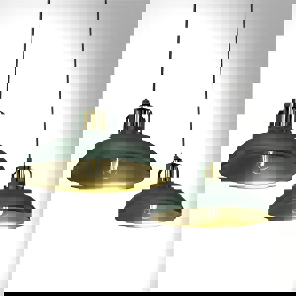 This double pendant is hand made from durable metals and finished in bottle green with a lovely golden interior to the shade as well as a golden brass effect finish to the top of each lamp.