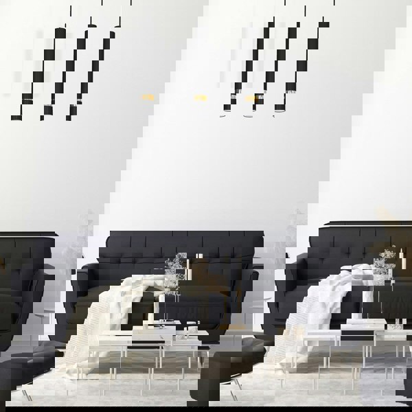 The Joker by Milagro is a range of beautifully hand made designer lights available in matt black with gold or chrome detail. The Joker has minimalistic slender cylinder shades resembling spot lights and has options ranging from the single wall or ceiling lamp right up to the eye-catching 90cm 5 lamp pendant and the 100cm "spotlight bar" with 8 adjustable shades. The contemporary styling is minimalistic with a noble touch due to the luxurious detail and is well suited to complement both modern and classic interiors. All the options are designed for use with ultra low energy GU10 LED bulbs.