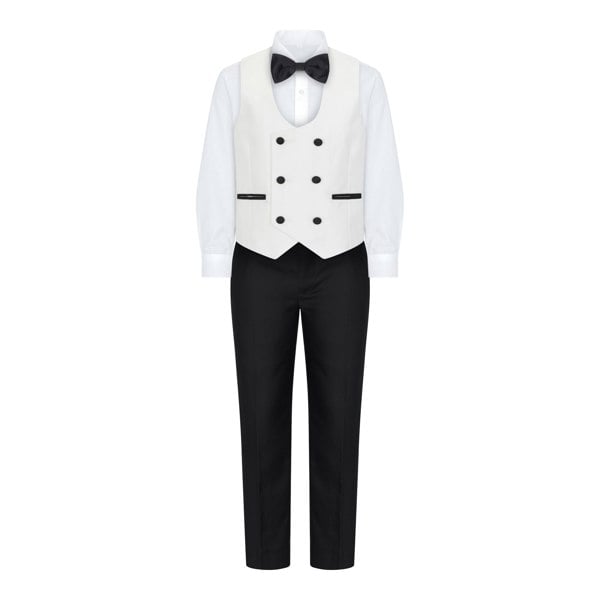 Elevate your little gentleman's style with this sophisticated 5-piece slim fit suit, which includes a luxurious 2 button white / black lapel jacket, black trousers with an adjustable waist, a matching 4-button white waistcoat, a crisp white shirt, and a coordinating black bow tie.