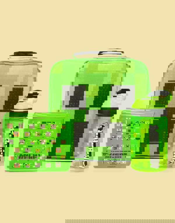 The set contains 3 items: a Minecraft Creeper lunch bag, Minecraft characters snack pot, and a Minecraft water bottle that all feature the face of the famous villain from the Mojang video game, the Creeper