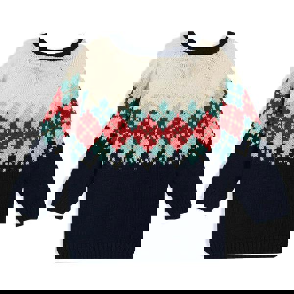 The sweater features a classic argyle design in Medieval Blue, Mars Red, and Aquifer with a Marshmallow base, creating a smart and cheerful look. The shoulder opening with branded wooden buttons ensures fuss-free dressing, while the ribbed neckline, cuffs, and hem provide a neat and comfortable fit.