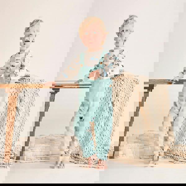 Add a touch of timeless charm to your little one’s wardrobe with our Knitted Mint Dungaree & Train Print Top Set – crafted for comfort, warmth, and everyday play. Made from beautifully soft 100% cotton knit, the cosy dungarees are a true knitwear treat, perfect for chilly days and snuggly moments.