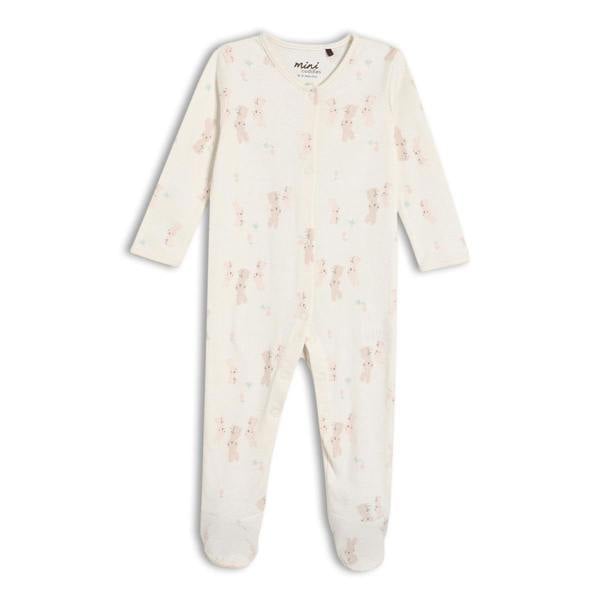 Sleepsuit – 100% cotton interlock with an all-over bunny print, popper fastening for easy changes, attached scratch mitts and fully bagged out feet for extra comfort.