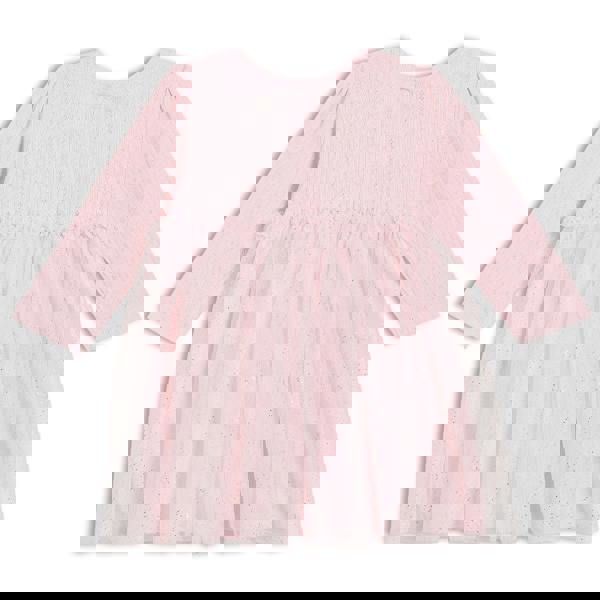 Bring extra sparkle to your little one’s wardrobe with our Pink Glitter Tulle Dress – a sweet blend of comfort, charm, and delicate details. The bodice is crafted in soft drop needle pointelle with embroidered floral artwork, while the skirt features a glitter mesh overlay for a magical touch. Perfect for special occasions, family outings, or gifting.