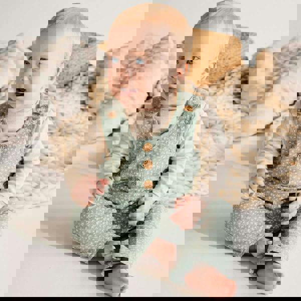 Dress your little one in woodland charm with our Iceberg Green Button Dungaree 2-Piece Set – a cosy outfit designed for everyday adventures and those precious outings. Crafted from soft cotton fabrics, this set combines style, comfort, and practical details that parents love.