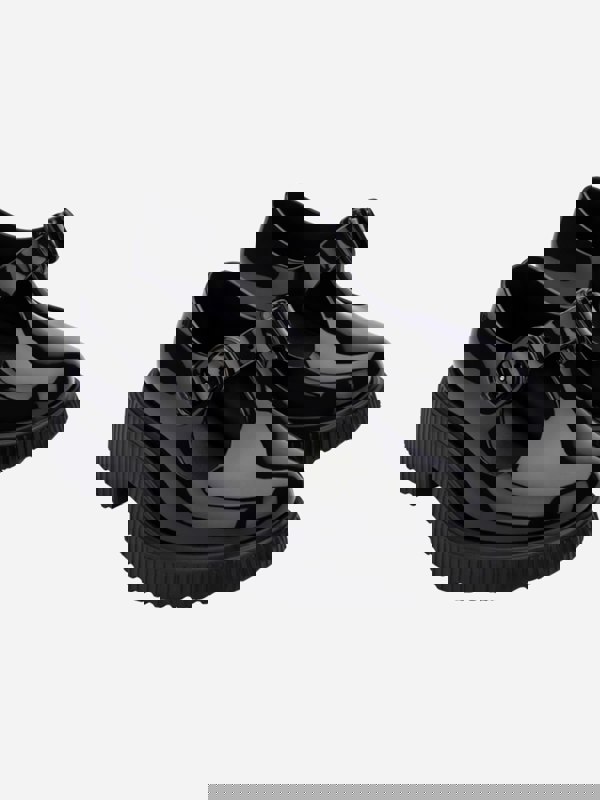 Mini Melissa weave timeless archives with modern materials. These girls Jackie shoes in black are made in a patent-style PVC design with an upper chunky rubber heel and a buckle fastening.