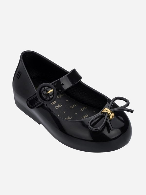 Mini Melissa Girls Sweet Love ballerinas in black combine timeless archive styling with modern materials. Made in refined PVC, this pair suits school wear while keeping the look clean and classic. A maxi bow sits on the vamp, with an exposed top of foot for a traditional ballerina shape. The closed, round toe and flat heel keep the silhouette simple, while a strap with a faux metal buckle secures the fit. Finished with a comfy insole for everyday wear.