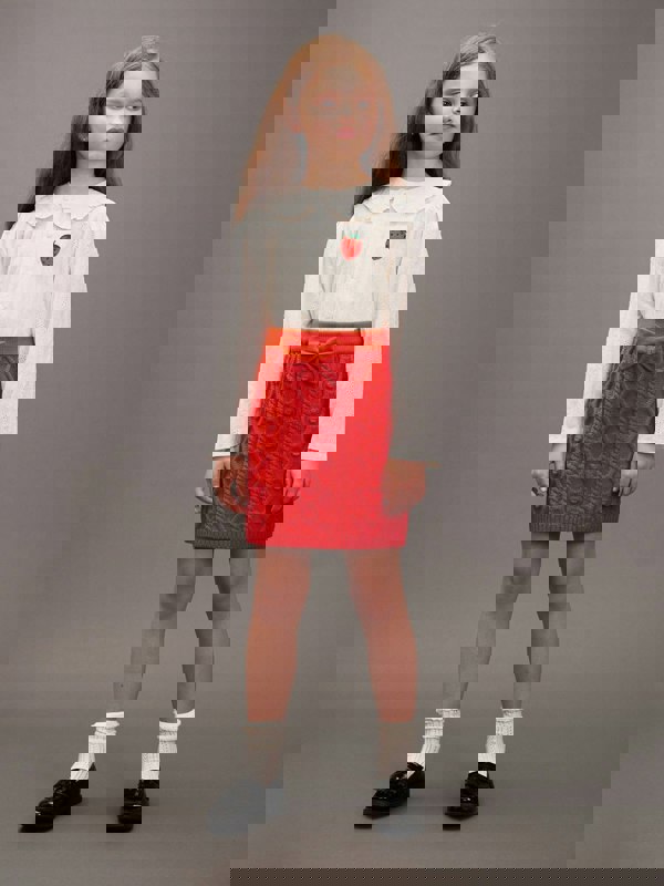 This girls’ blouse from Mini Rodini comes in white cotton with schiffli embroidery and a small strawberry motif. A Victorian-inspired collar and long sleeves create a neat, traditional silhouette, finished with pearlescent buttons at the front.