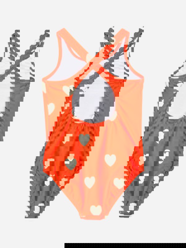 Mini Rodini girls heart print swimsuit in red, updated for the AW2024 collection. The bold heart print adds a playful look, while the red colourway keeps the design bright and easy to spot.