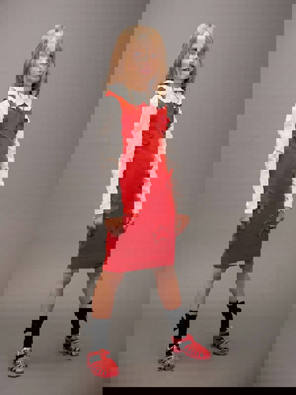 This girls’ knitted vest dress by Mini Rodini comes in red with a floral motif. A knit construction forms the main body of the design, combining a simple vest-dress shape with an eye-catching flower pattern.