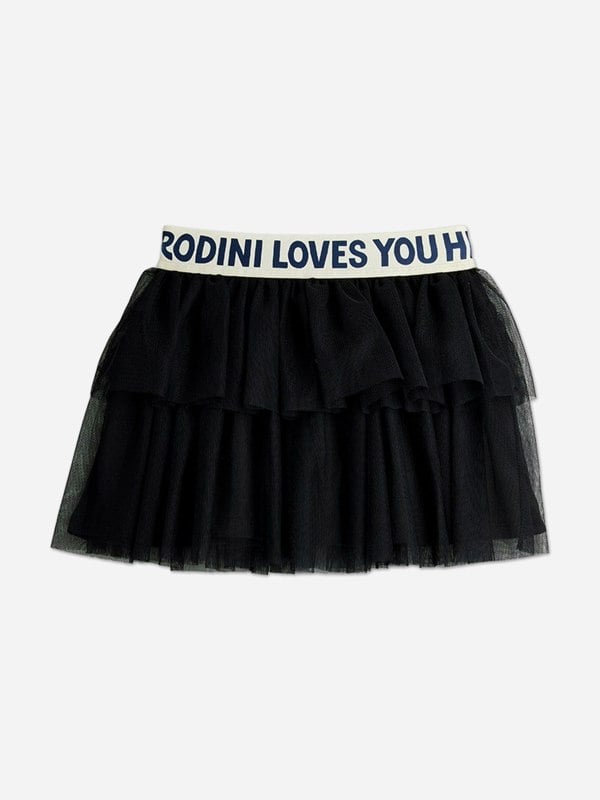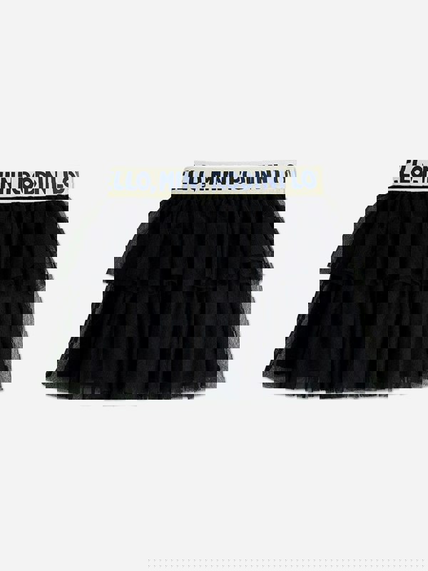 This Mini Rodini girls tulle skirt in black brings a playful finish to Halloween outfits. It is made from layers of soft, voluminous tulle for a full silhouette, with a printed elastic waistband for a secure fit. The material is 100% recycled polyester, and the skirt is GOTS certified.