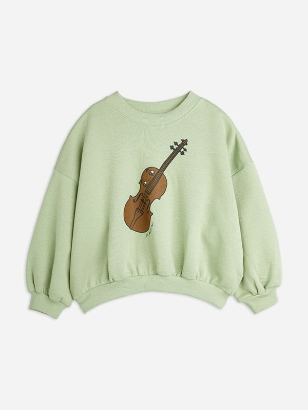 Mini Rodini combine eco-friendly materials with vibrant imaginings to create fun and unforgettable aesthetics. This girls green sweatshirt is engineered in beautiful high quality. It showcases a vibrant violin on the front with a cartoon face attached for comical effect.