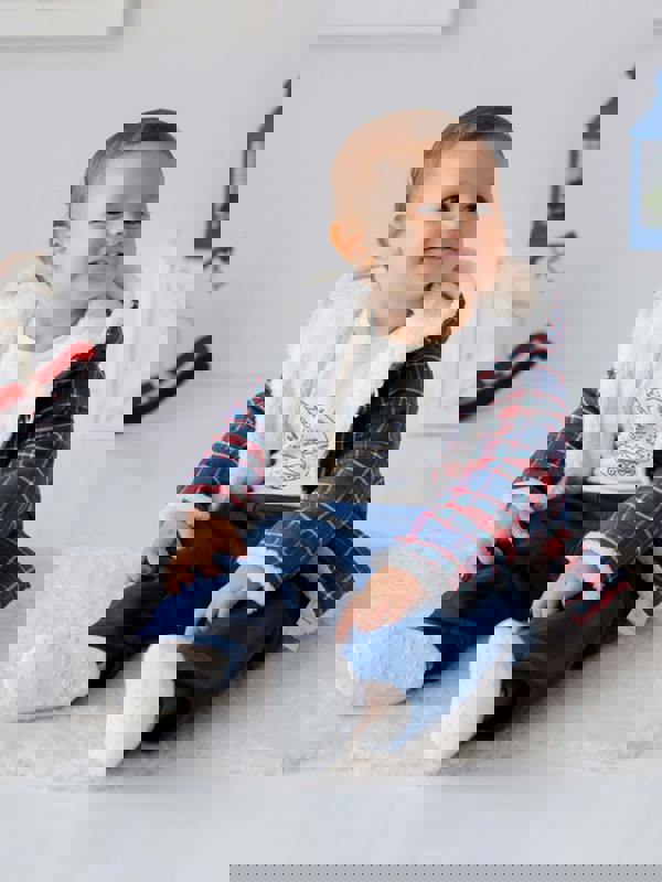 The plaid hooded jacket features an all-over plaid pattern and a warm plush inner lining, while the long-sleeve T-shirt is finished with a space-themed print and a soft cotton fabric feel. Completing the set, the navy blue trousers are designed with a flexible structure for a comfortable fit. Made from a cotton and polyester blend, this set is exclusive to Childsplay Clothing.
