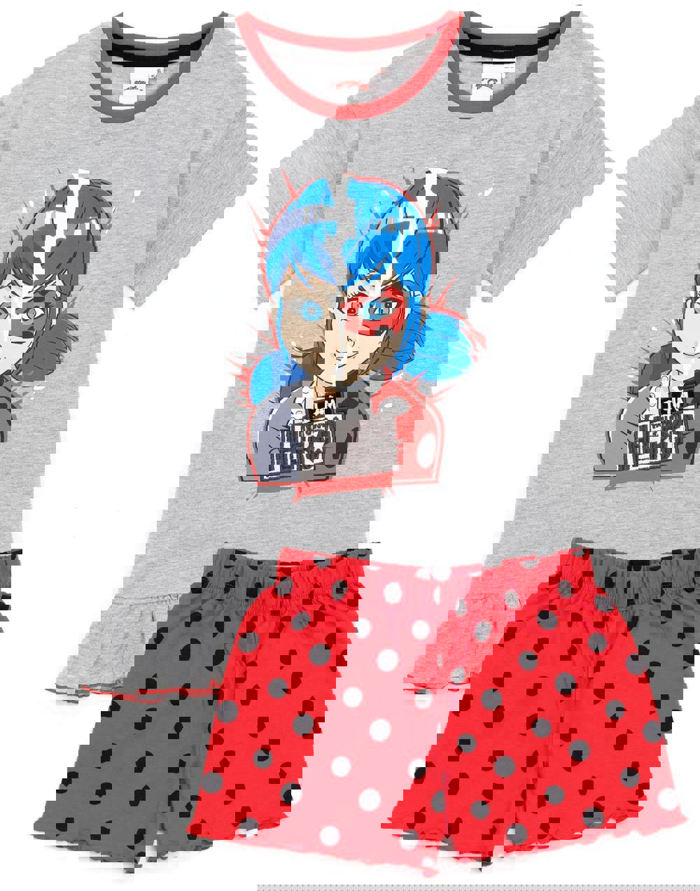The awesome childrens frilled hem t-shirt comes in a grey with red hem details featuring the much-loved animated character Ladybug with slogan 'I AM MY OWN HERO'! Paired perfectly with polka dot black and red long-length joggers or shorts making a must have outfit for fancy dress parties, birthdays, Christmas and all special occasions