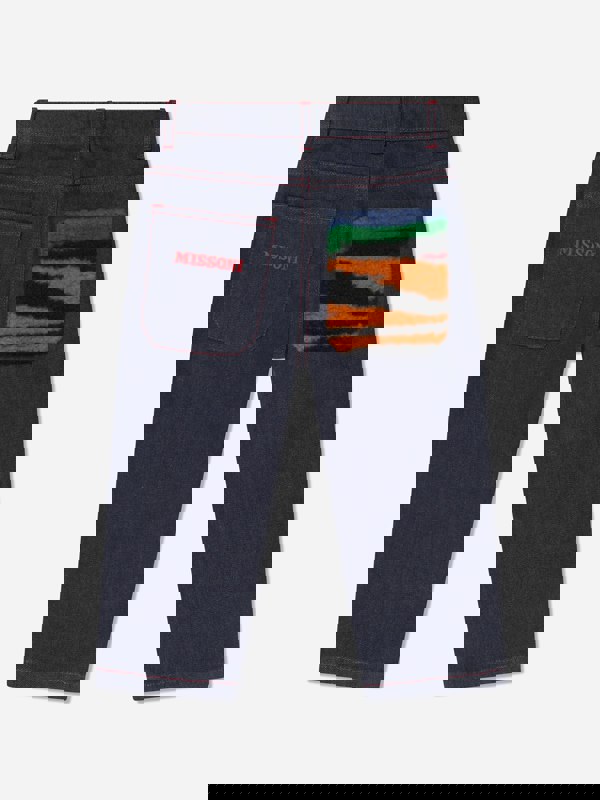These Missoni boys trousers bring classic denim details together with distinctive branding. Made in Italy from stretch denim, they have a five-pocket layout with metal rivets and a button and zip-fly fastening. A multi-hued tiger stripe pattern is embroidered on the back pocket, while the other pocket carries red logo needlework.