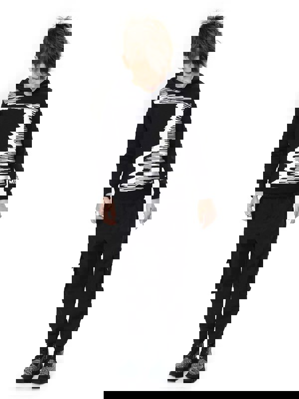 These boys’ black cargo trousers from Missoni combine a casual combat shape with refined detailing. Virgin wool gives a soft handle, while contrast monochrome striped belt loops add a distinctive finish. A tonal embroidered logo sits on the left leg pocket. The elasticated waistband includes a button fastening, supported by a zip fly for a secure closure. Cargo pockets and two back pockets complete the practical layout, and button-fastened cuffs finish the legs. Made in Italy.