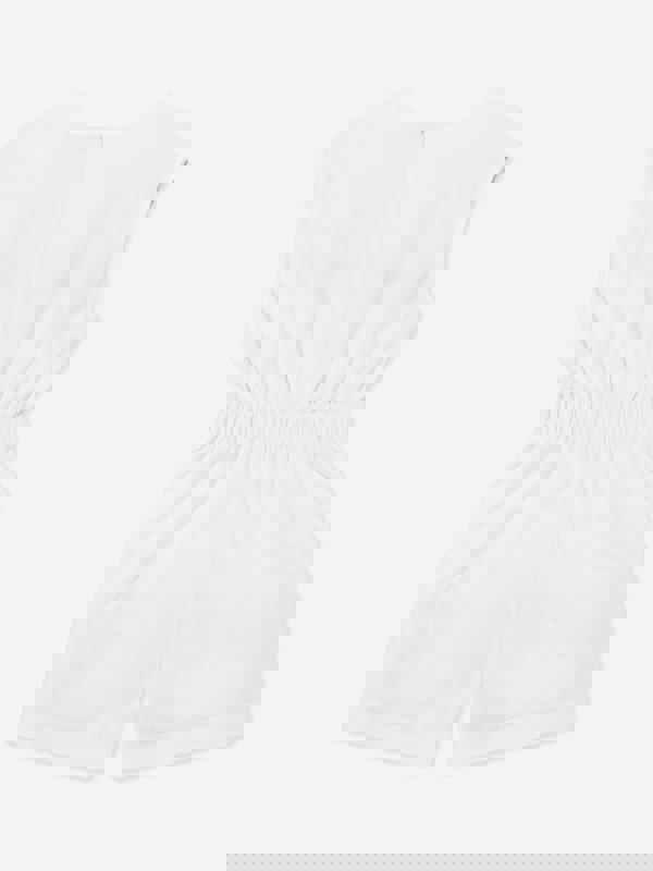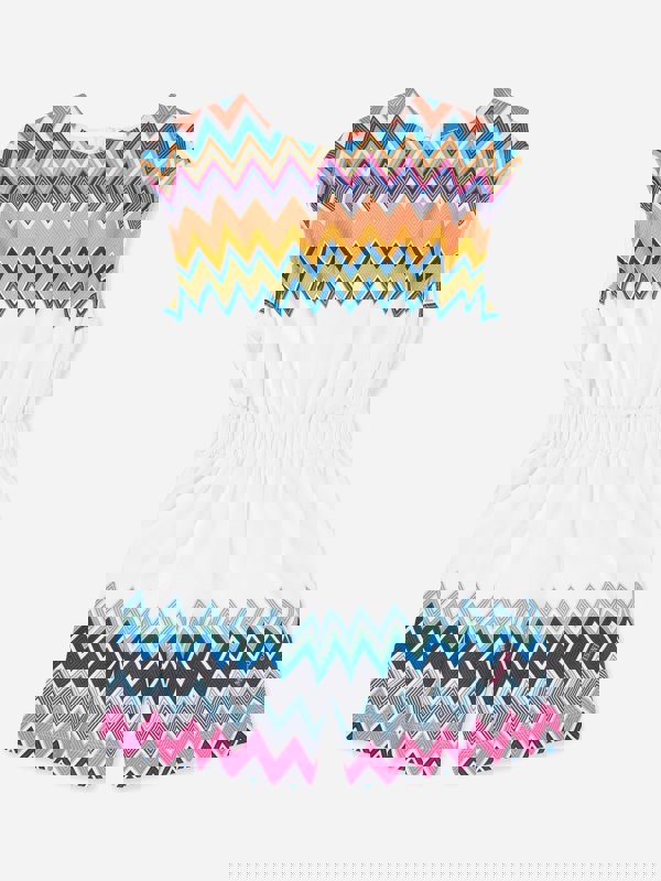 Missoni Girls Zigzag Jersey Playsuit in white with short sleeves and a multicolour zigzag print. Made in Italy, this one-piece has a round neck and a zip fastening for a clean finish. The waist is elasticated and the back is ruched, creating a defined shape through the body. Crafted from 100% cotton, it offers a lightweight feel for warm-weather wear.