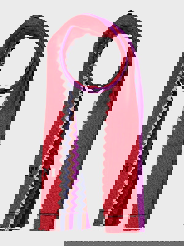Elevate your wardrobe with this iconic Missoni wool scarf, a timeless piece that embodies Italian craftsmanship and refined elegance. The signature zigzag pattern in rich red tones, accented with subtle multi-coloured details, creates a striking visual statement. Crafted from premium wool, this generously sized scarf (180 x 40 cm) offers versatility for layering, draping, or accessorising any ensemble. Perfect for those who appreciate luxury textiles and distinctive design, this Missoni scarf seamlessly transitions from casual to formal occasions with understated sophistication.