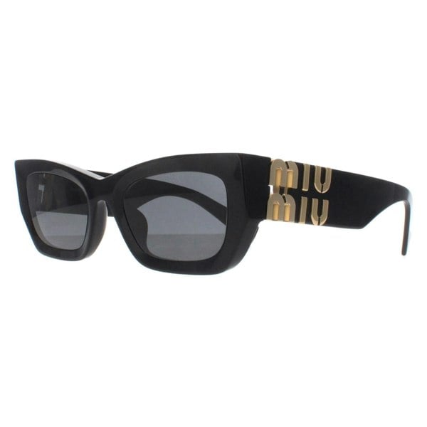 A sharp rectangular silhouette sets the tone for the Miu Miu MU09WS 1AB5S0 sunglasses, finished in black with dark grey lenses. The plastic frame keeps the look clean and modern, while the temple branding adds a clear designer signature without overwhelming the shape.