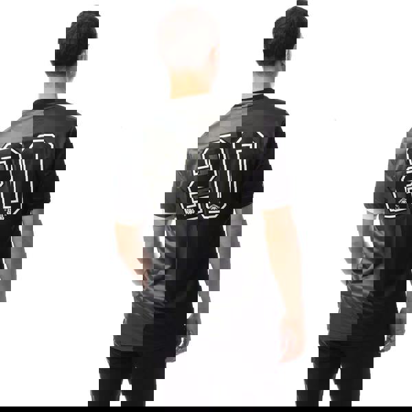 This men’s game jersey is made from 100% polyester and finished in black. The design combines colour block panels with a logo and number detail for a bold, sport-led look. A rounded V neck and short sleeves keep the silhouette clean and easy to wear.