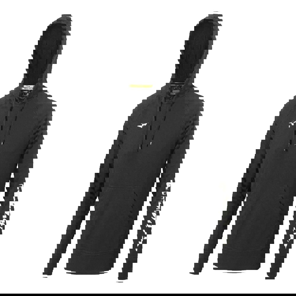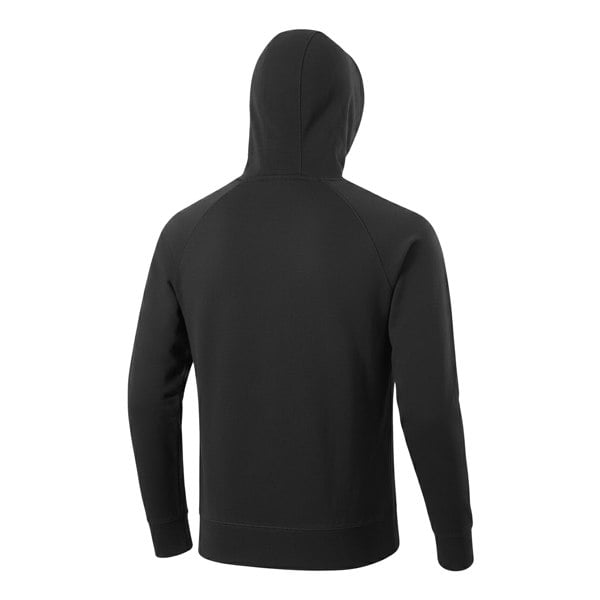 This men’s hoodie is made from terrycloth in a 70% cotton, 30% polyester blend. It has a hooded neckline with a sew-on hood and an adjustable drawstring. The design combines a plain base with logo detailing and a sleeve print.