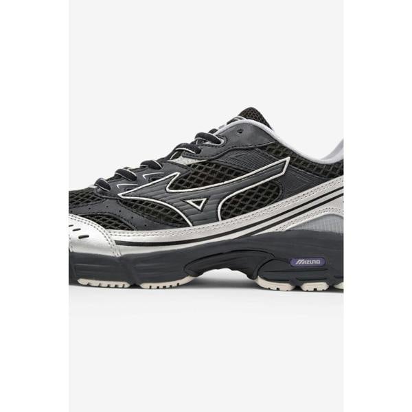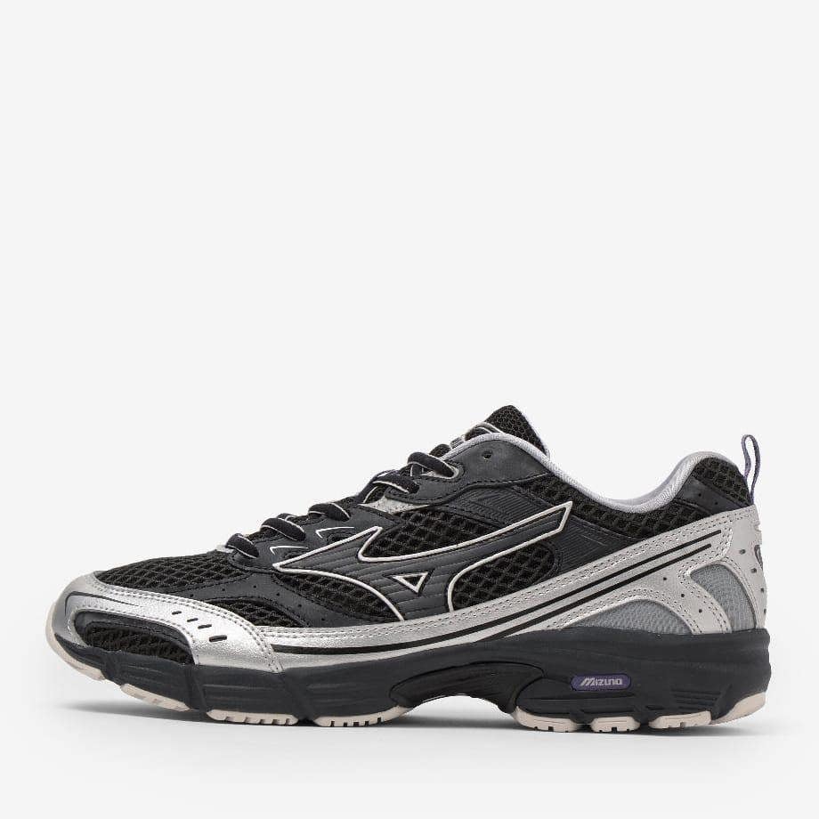 Mizuno MXR casual trainers in black with a low-cut profile and round toe. The design includes contrast detailing and a logo, finished with a lace-up fastening for a secure fit. A pull tab adds a practical touch for putting them on and taking them off.