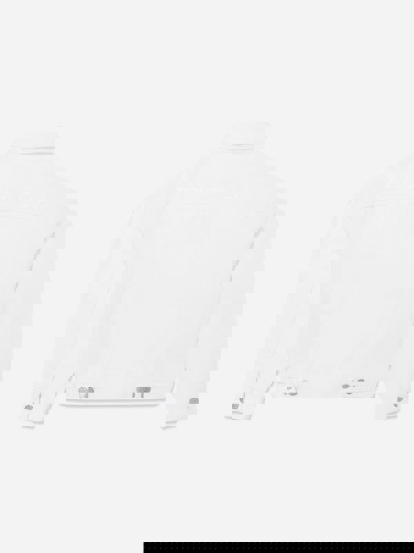 MM6 Maison Margiela kids denim jacket in ivory, woven in cotton. The design includes a front button fastening and a structured pocket layout, with chest flap pockets and two side inset pockets. Buttoned cuffs complete the finish for a clean, practical silhouette.