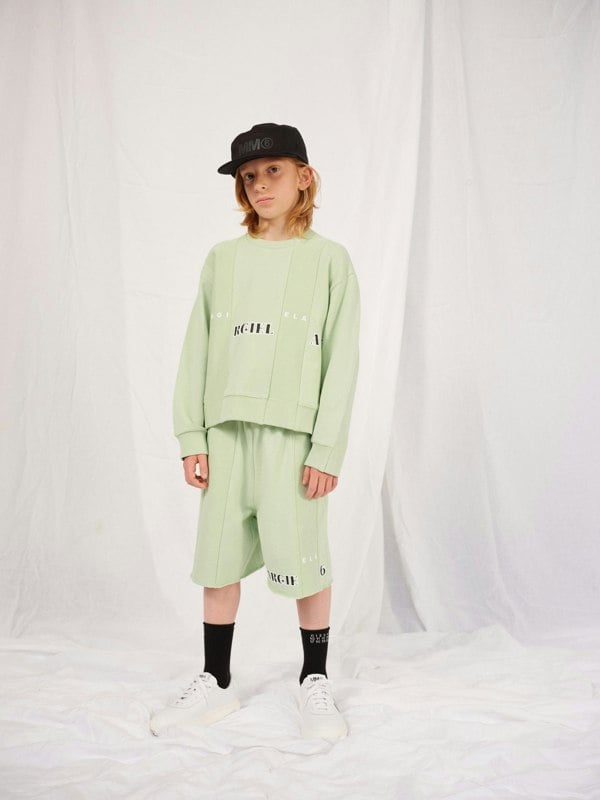 These MM6 Maison Margiela kids logo shorts come in green and are made from French terry in 100% cotton. Number printing sits alongside inside-out effect seams, creating a distinctive look with visible construction details.