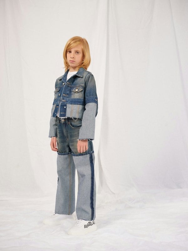 MM6 Maison Margiela brings modern innovation and technicality to this kids re-cut shaded denim jacket in blue. Made from 100% cotton, it has a classic collar and long sleeves for a traditional denim silhouette. Two front chest pockets add practical detail, while contrast lining at the hem gives a distinctive finish. Golden threading completes the look with a refined accent.
