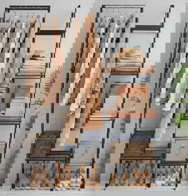 Stay organised in style with this multifunctional freestanding clothes rail. Designed with a sturdy metal frame in matte black, it combines a spacious hanging rail with five open storage shelves, giving you the perfect balance between hanging and folded storage.