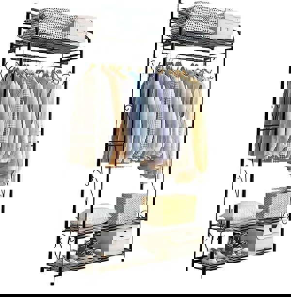 With a total load capacity of up to 100 kg , this rack offers plenty of strength for your daily wardrobe needs. The top hanging rod and three-tier shelves provide versatile storage for coats, shirts, handbags, baskets, and shoes, while the curved decorative lines add a stylish touch that doubles as convenient hooks for umbrellas or scarves.