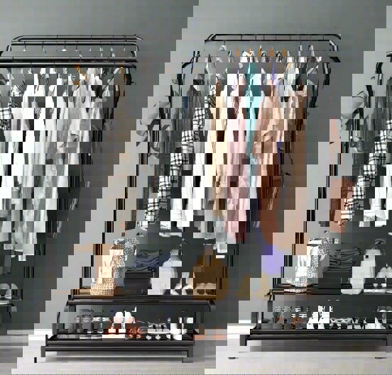 Organize your wardrobe in style with this Heavy Duty Double Rail Clothes Rack, designed for homes, bedrooms, and retail displays. Made from rust-proof thick steel tubing, this modern freestanding garment stand offers long-lasting strength and impressive load capacity up to 50kg – ideal for hanging coats, suits, and dresses without bending or wobbling.