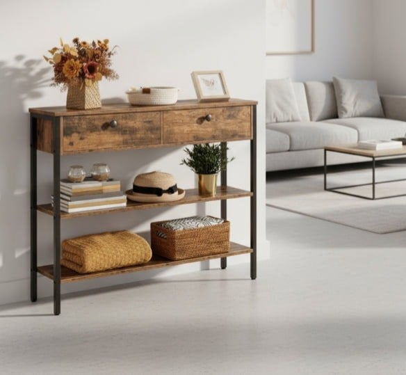 Bring warmth and function to your home with this Rustic Brown Console Table — the perfect blend of industrial charm and practical storage. Designed with a slim profile, it fits effortlessly in hallways, behind sofas, or along empty walls, helping you create an inviting and tidy living space.