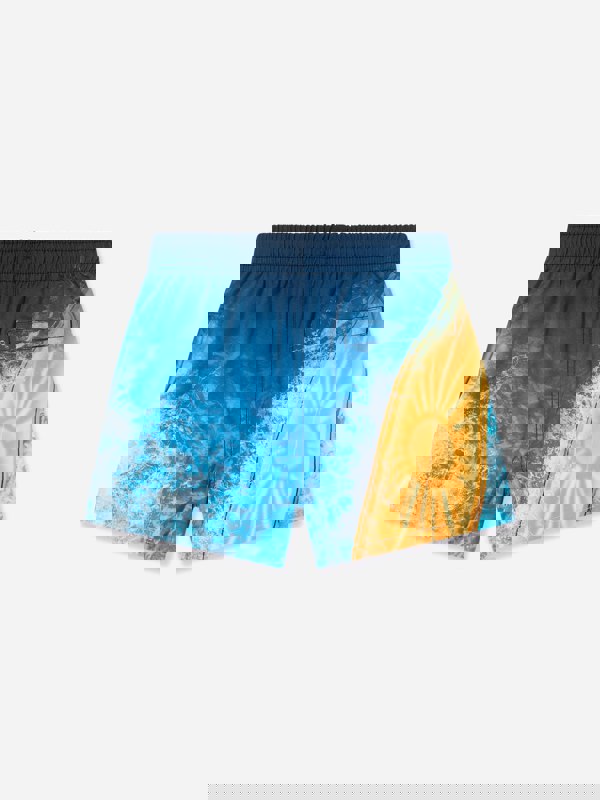 Molo boys Niko swim shorts in blue with a surf art print. Made for summer wear, they suit days at the beach or by the pool and include UPF50+ sun protection.