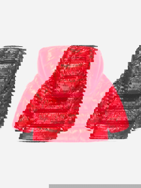 Moncler Enfant New Maya jacket in red for baby boys. Made in Italy, this down padded puffer style has tiered padding and a hood for a classic outerwear silhouette. Long sleeves and elasticated cuffs keep the finish neat, while a zip fastening and press-stud fastenings secure the front. Side pockets and an extra pocket on the sleeve add practical storage. An embroidered Moncler badge completes the look.