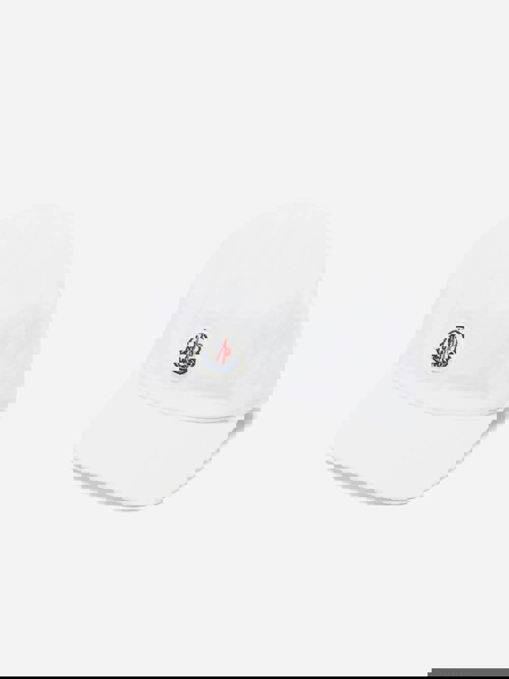This Moncler Enfant baseball cap for baby boys comes in white cotton gabardine with a cotton lining. A felt Moncler logo patch sits at the front for a clear branded finish. The back strap uses tricolour elastic for a secure fit.