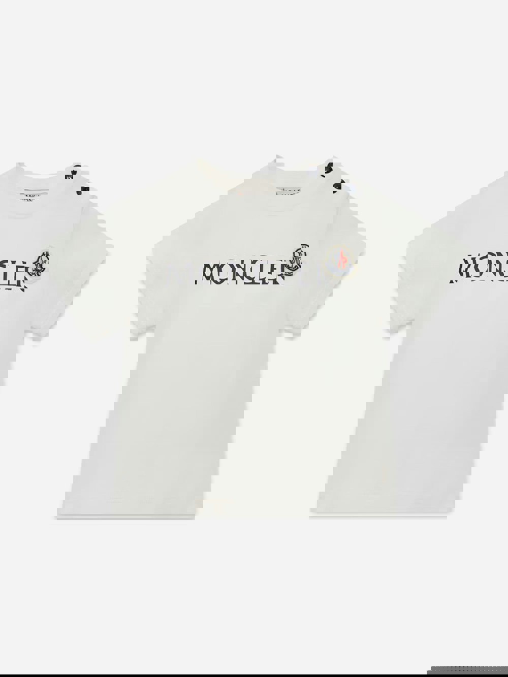 This Moncler Enfant t-shirt for baby boys comes in ivory and is made in Turkey. Crafted from stretch jersey, it has a classic crew neck and short sleeves for a clean, simple finish. A logo detail completes the look, while a snap button closure on the shoulder supports easy dressing.