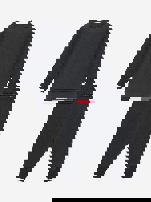 This Moncler Enfant tracksuit set for baby boys comes in navy with a tricolour hem for a distinctive finish. Made in Portugal, it is crafted from stretch cotton fleece and includes a sweatshirt and matching bottoms. The sweatshirt has a crew neck and a snap button closure on the shoulder for easy dressing, while rib knit trim adds structure at the edges. The bottoms are finished with an elasticated waistband.